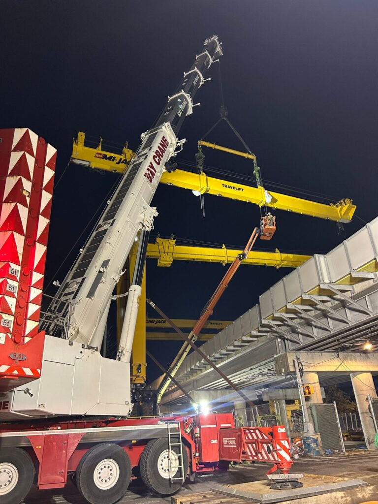To begin Phase II, the two Mi-Jack MJ200HD cranes had to be disassembled and relocated to East 128th Street – a complex operation requiring smaller cranes to lift and move the components. The top beams alone measure 94 feet in length and weigh approximately 83,000 pounds. Originally allotted two nights for the top beam removal, Mi-Jack completed the task in only one night. “Thanks to our Mi-Jack Engineering team and on-site technicians, the top beams were perfectly balanced and removed in one night—flawlessly,” said Luke Ninomiya, Aftermarket Sales Rep, Eastern Region. This precise relocation sets the stage for Phase II, ensuring the cranes are ready to support the continued replacement of the aging viaduct sections safely and efficiently.